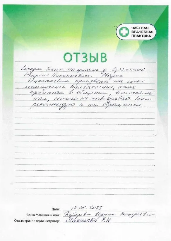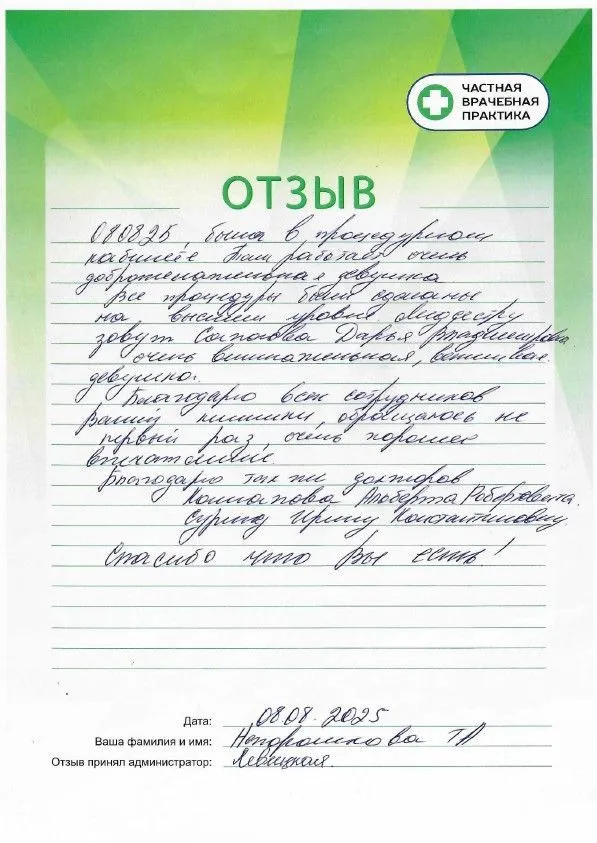 08.08.25. была в процедурном кабинете. Там работала очень доброжелательная девушка. Все процедуры были сделаны на высшем уровне. Медсестру зовут Сапогова Дарья Владимировна, очень внимательная, вежливая девушка. Благодарю всех сотрудников вашей клиники, обращаюсь не первый раз. Очень хорошее впечатление. Благодарю так же докторов: Кашапова А.Р. и Сурину И.К.