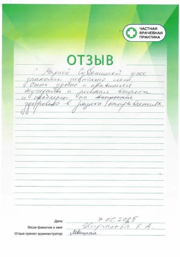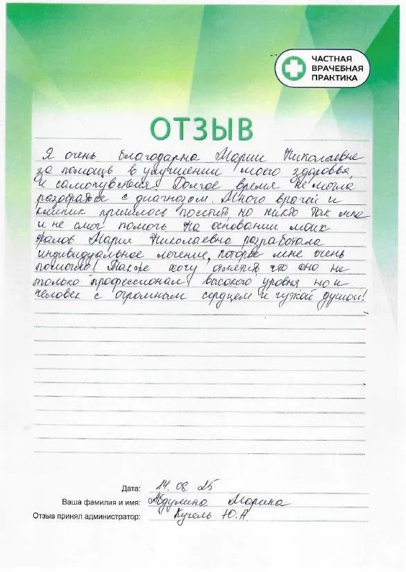 Я очень благодарна Марии Николаевне за помощь в улучшении моего здоровья. Долгое время не могла разобраться с диагнозом. Много врачей и клиник пришлось посетить, но никто так и не смог мне помочь. На основании моих жалом Мария Николаевна разработала индивидуальное лечение, которое мне очень помогло. Так же хочу отметить, что она не только профессионал высокого уровня, но и человек с огромным сердцем и чуткой душой!"