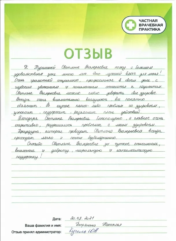 Хочу поблагодарить Туранину Светлану Валерьевну. Это Человек с большой буквы. Вела беременность в 2014-2015 году, я всю беременность пархала. Практически спасла мне жизнь своим профессионализмом тогда когда меня чуть не угробили в государственной поликлинике.
