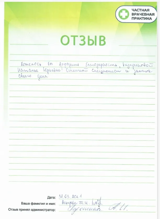 Хочу выразить огромную благодарность Язовских Т.Б. Мое знакомство с ней состоялось больше года назад и с этого времени это мой доктор, мой ангел-хранитель, мой лучик света и позитива. Очень приятно, что Татьяна Борисовна очень чутко относится к каждому пациенту, вникает в проблемы каждого, грамотно и доходчиво все рассказывает. Тысячу раз спасибо Татьяне Борисовне и "Частной врачебной практике", особенно девочкам администраторам.