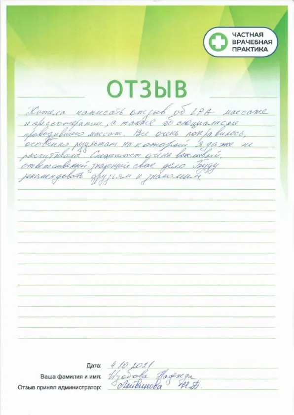 Хотела бы написать отзыв от LPG массаже и прессотерапии, а так жен о специалисте, проводившего масаж. Все очень понравилось, особенно результат, на который я даже не рассчитывала. Специалист очень вежливый, ответственный, знающий свое дело. Буду рекомендовать своим близким и знакомым.