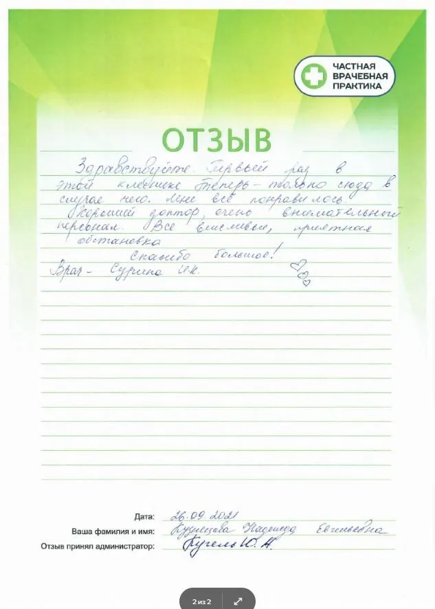 Выражаю огромную благодарность вашему коллективу за заботу о здоровье своих пациентов. За внимательное доброжелательное отношение. Являюсь вашим постоянным пациентом с 1998 года. Большое спасибо за сегодняшний прием Суриной Ирине Константиновне, за то что очень подробно и профессионально ответила на все вопросы и во многом помогла и посоветовала разобраться с состоянием здоровья