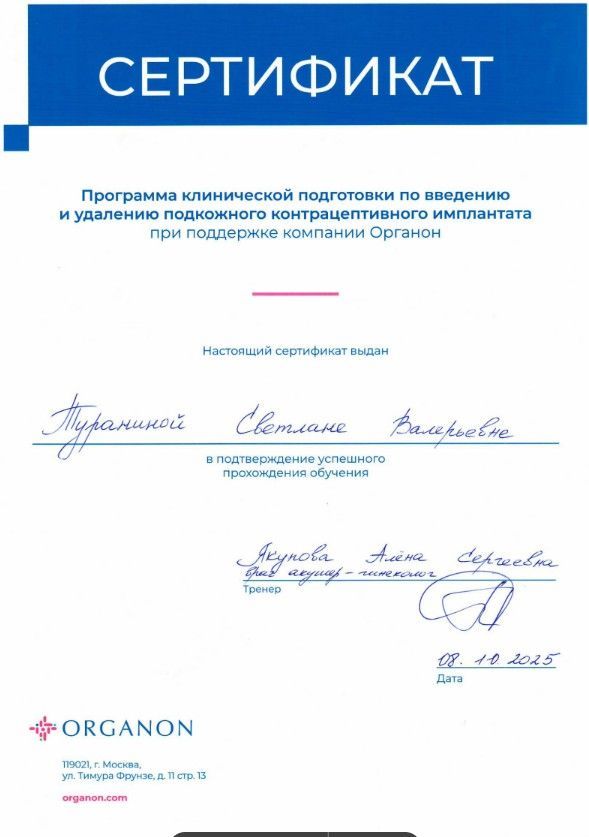 - 2017 г. - Сертификат "Акушерство-гинекология" выдан Южно-Уральским государственным медицинским университетом 17 апреля, г. Челябинск