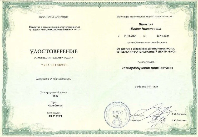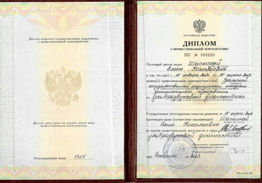 - 2003 г. - Диплом о профессиональной переподготовке по ультразвуковой диагностике. Уральский государственный медицинский университет, г. Челябинск