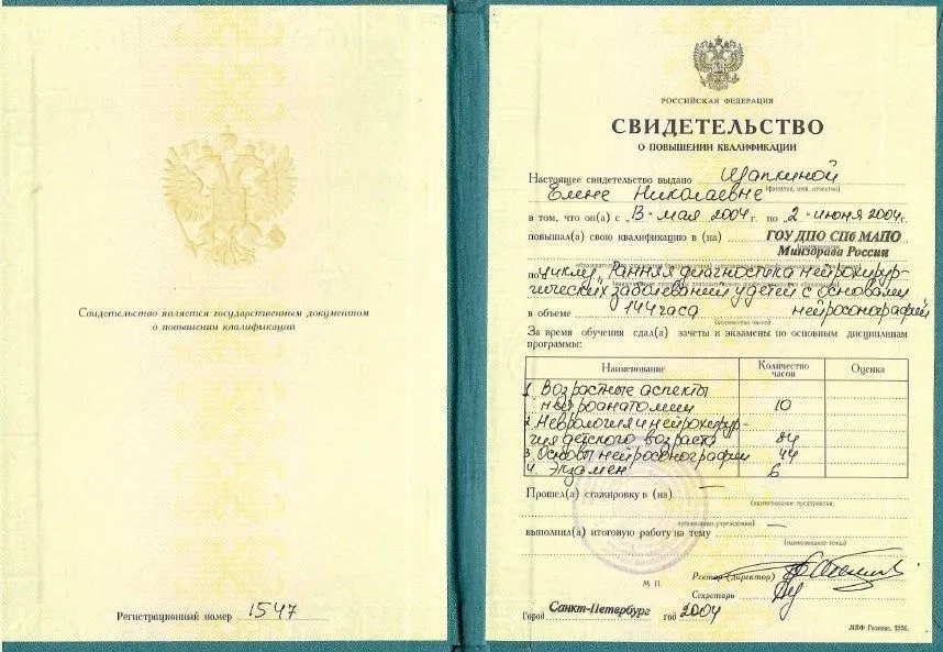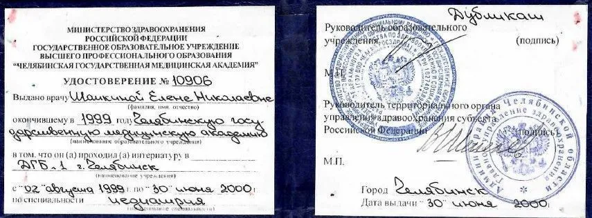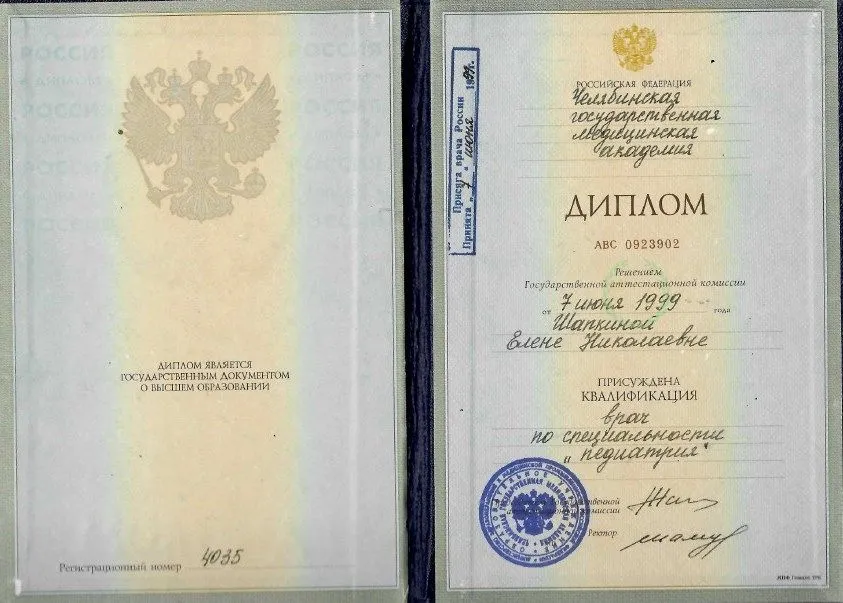 - 1999 г. - Диплом о высшем образовании. ГОУ ВПО «Челябинская государственная медицинская академия». Квалификация – врач -педиатр. Челябинск