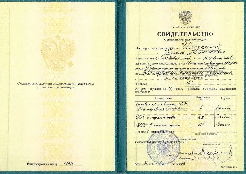 - 2006 г. - «Ультразвуковая диагностика в акушерстве и гинекологии», Институт повышения квалификации ФМБА