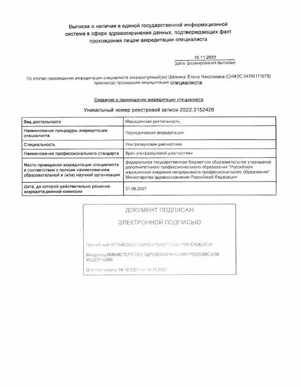 - 21.06.2022 - 21.06.2027 год аккредитация специалиста по специальности "Ультразвуковая диагностика" федеральное государственное бюджетное образовательное учреждение дополнительного профессионального образования "Российская медицинская академия непрерывного профессионального образования "Министерства здравоохранения Российской Федерации