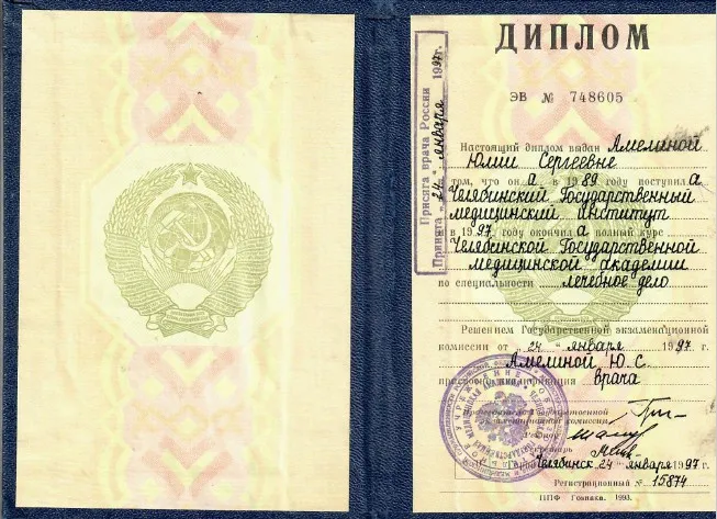 - 1997 г. - окончила «Челябинский Государственный медицинский институт» по специальности "Лечебное дело", присвоена квалификация -"Врач"