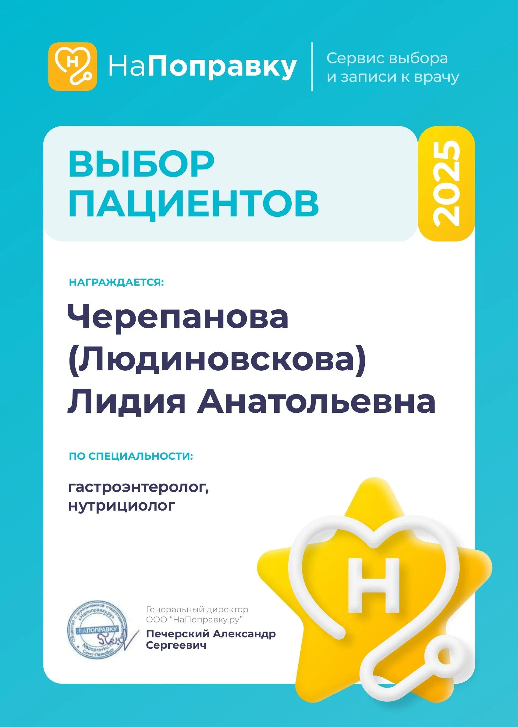 - Премия НаПоправку: Выбор пациентов 2025 - лучший в рейтинге гастроэнтерологов, нутрициологов по Челябинской области