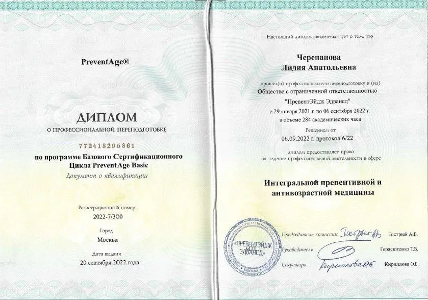 - 2017 г.- ФГБОУ ВО ЮУГМУ Минздрава России, г. Челябинск, профессиональной переподготовка по специальности «Гастроэнтерология»