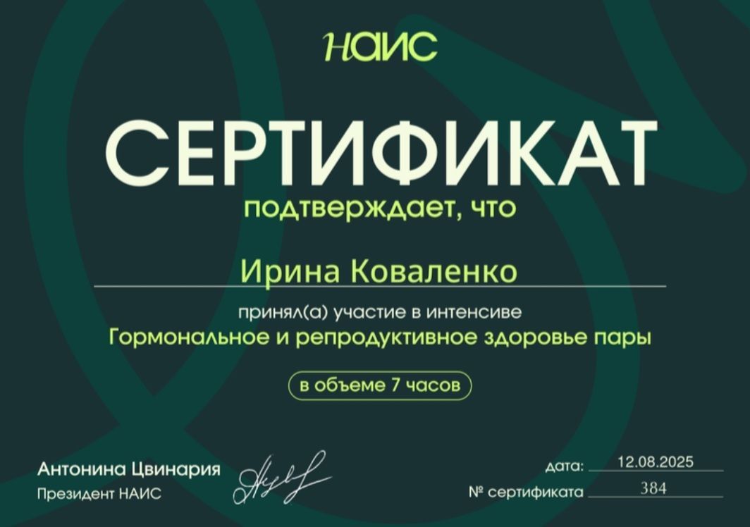 - 2024 год Диплом о профессиональной переподготовке АНО ДПО "Международный институт интегративной нутрициологии" -присвоена квалификация "Детский интегративный нутрициолог"