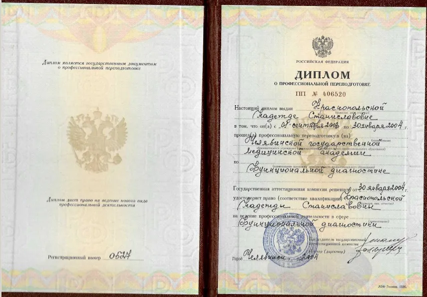- 30.01.2004 г. Диплом о профессиональной переподготовки по программе "Функциональная диагностика", Челябинская Государственная медицинская академия", г. Челябинск