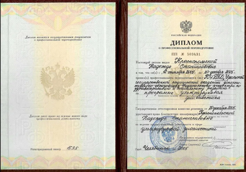 - 20.12.2005 г. Диплом о профессиональной переподготовки по программе "Ультразвуковая диагностика", Уральская государственная медицинская академия дополнительного образования федерального агентства по здравоохранению и социальному развитию, г. Челябинск