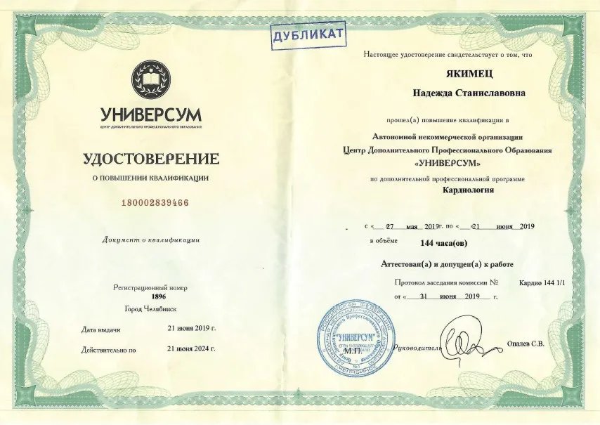 - 21.06.2019 г. Удостоверение о повышении квалификации по дополнительной профессиональной программе "Кардиология", Центр Дополнительного Профессионального Образования " УНИВЕРСУМ", г. Челябинск
