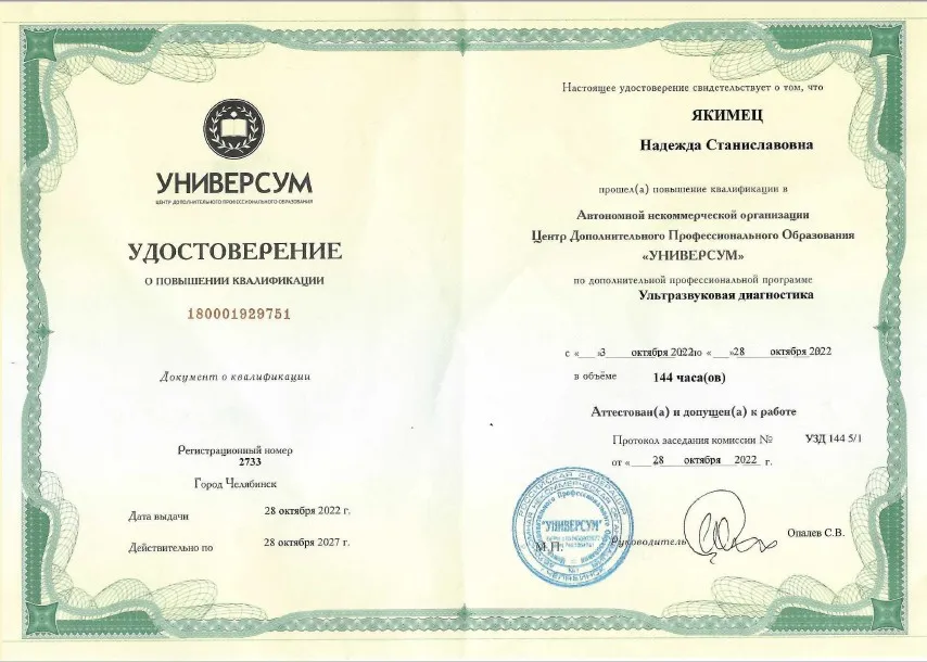 - 28.10.2022 г. Удостоверение о повышении квалификации по дополнительной профессиональной программе "Ультразвуковая диагностика", Центр Дополнительного Профессионального Образования " УНИВЕРСУМ", г. Челябинск