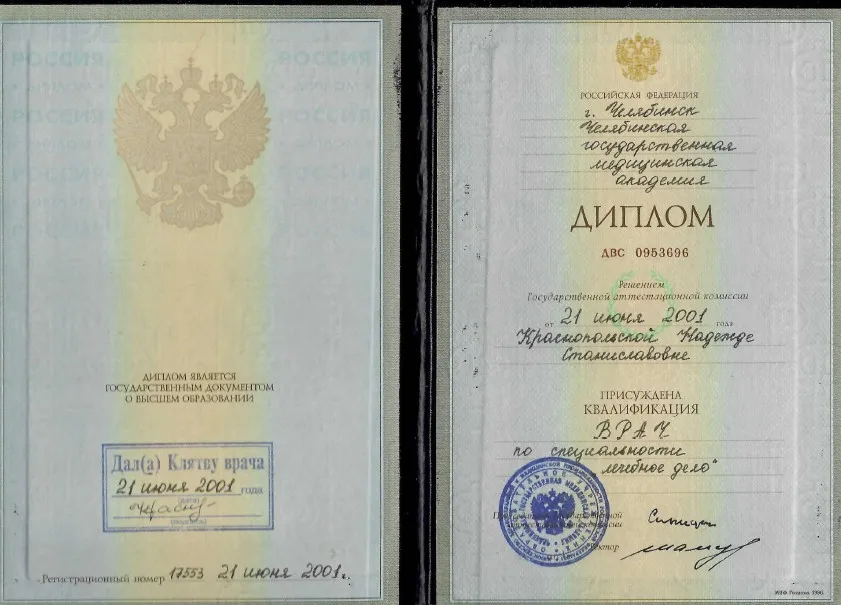- 2001 г., Челябинская Государственная медицинская академия, специальность "Лечебное дело", квалификация - врач, г. Челябинск