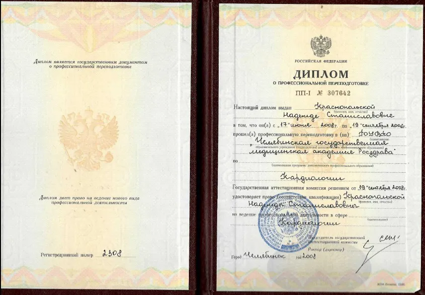 - 19.09.2008 г. Диплом о профессиональной переподготовки по программе "Кардиология", Челябинская Государственная медицинская академия", г. Челябинск