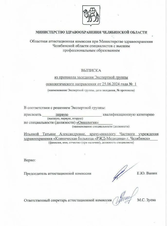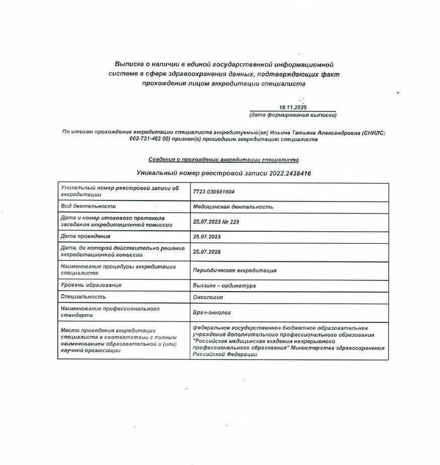 - Выписка о наличие в единой государственной информационной системе в сфере здравоохранения данных по специальности "Онкология" от 25.07.2023 года, действует до 25.07.2028 года. Уникальный номер реестровой записи: 2022.2438416