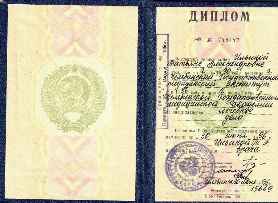 - 1996 год окончила Челябинский Государственный медицинский институт по специальности "Лечебное дело", Челябинск