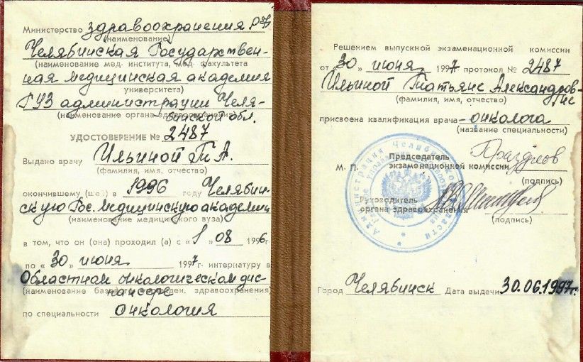 - 1997 год окончила интернатуру в Областном онкологическом диспенсере по специальности "Онкология", присвоена квалификация врача -онколога, Челябинск