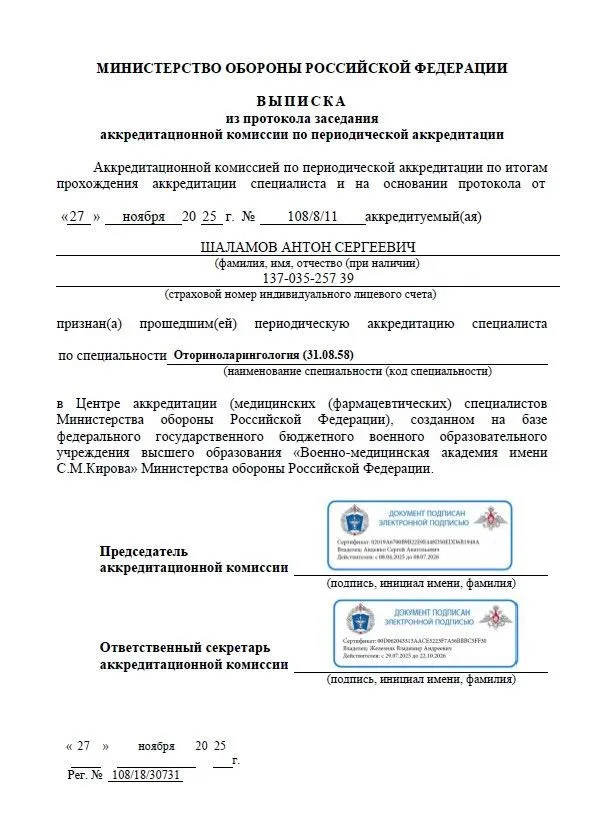- 29.11.2025 год аккредитация специалиста по специальности "Оториноларингология" в центре аккредитации специалистов Министерства обороны Российской Федерации на базе "Военно-медицинской академии имени С.М. Кирова" Министерства обороны Российской Федерации.