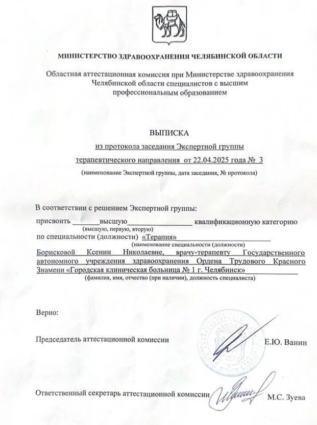 - 15 ноября 2022 года присвоена первая квалификационная категория по специальности -терапия. Приказ № 694 л Министерство здравоохранения Челябинской области.
