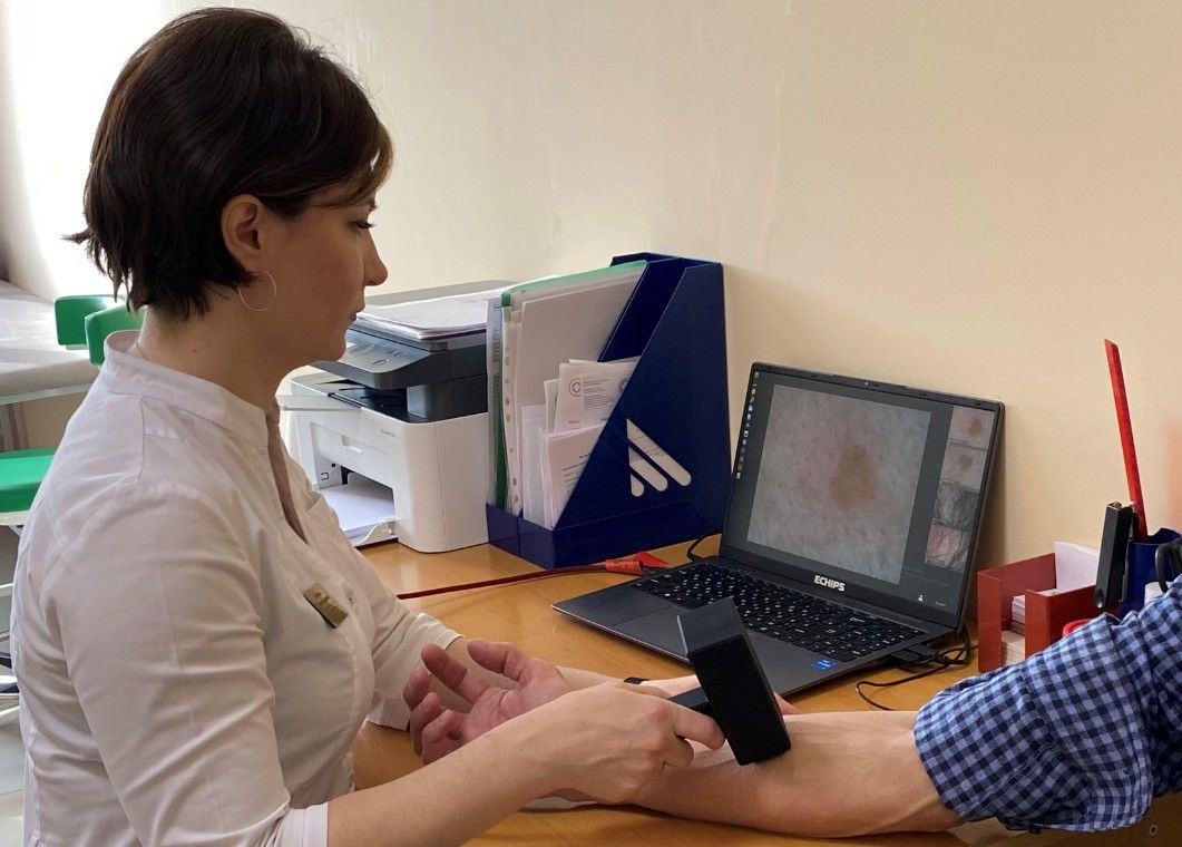 - Дерматоскопия. Используется специальный прибор (дерматоскоп) для осмотра кожи под многократным увеличением. Позволяет оценить структуру высыпаний и выявить признаки, невидимые невооруженным глазом.
